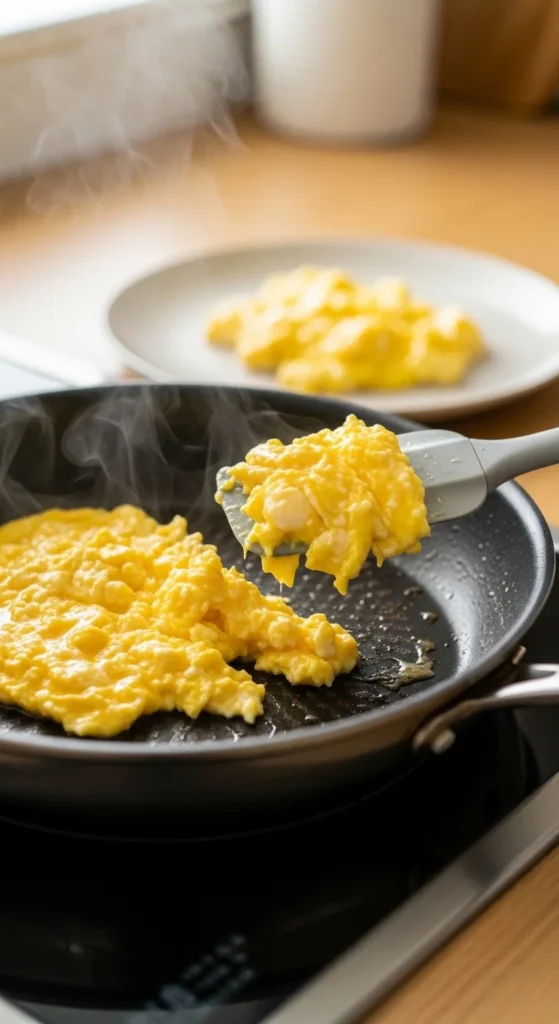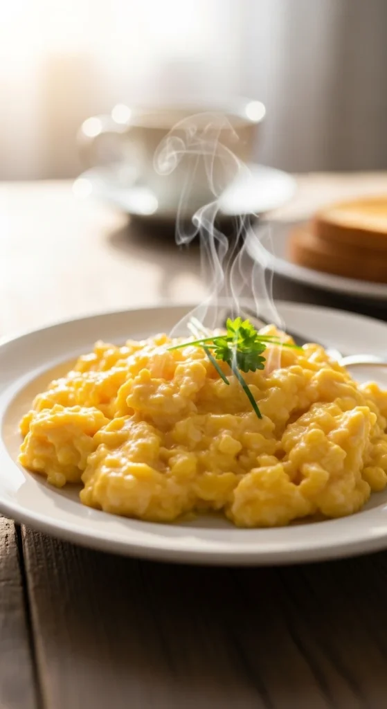 Light, creamy scrambled eggs are all about restraint. Low heat, gentle stirring, and pulling them off early create that soft, custardy texture everyone loves.