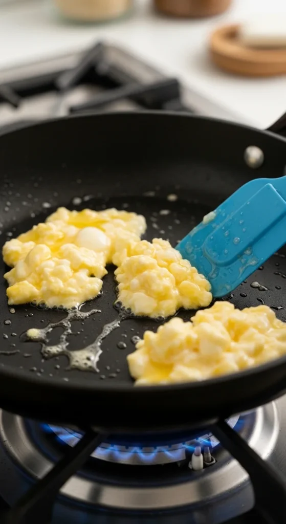 If eggs start to set too fast, pull the pan off the heat briefly and keep stirring.