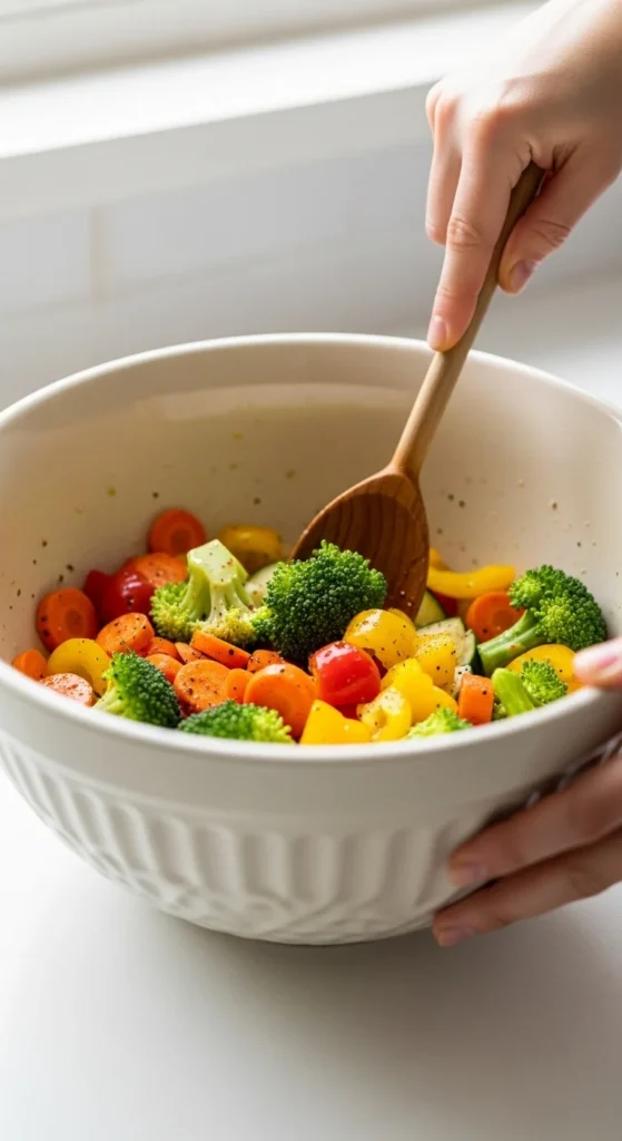 • Toss until vegetables are lightly coated, not swimming