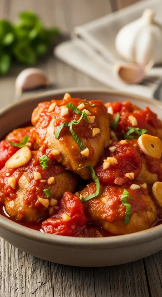 This chicken has a rich tomato flavor with garlic aroma.
