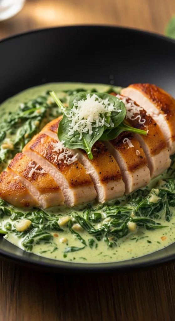 This chicken dish blends creamy sauce with fresh spinach. It feels smooth and comforting.