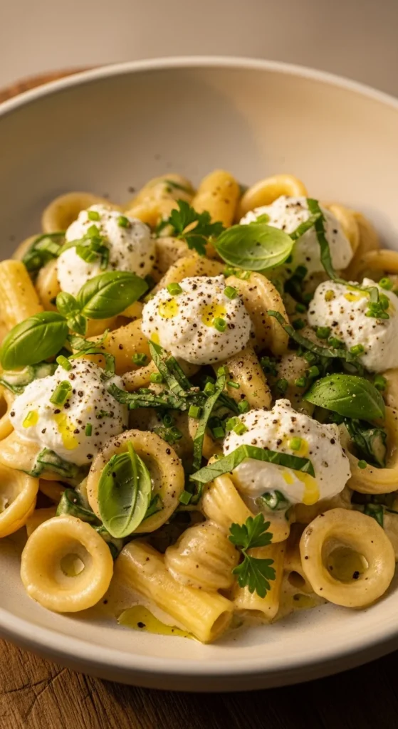 This pasta has a soft, creamy texture from ricotta cheese. It feels light and smooth, perfect for spring meals.
