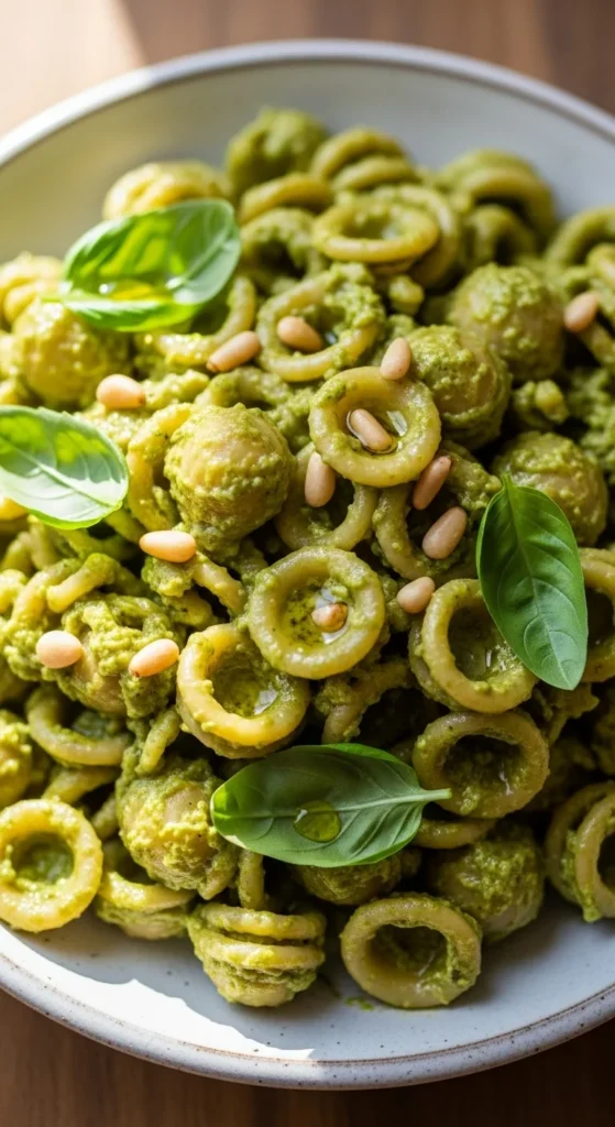 This pasta blends basil pesto with creamy sauce, creating a fragrant spring dish.
