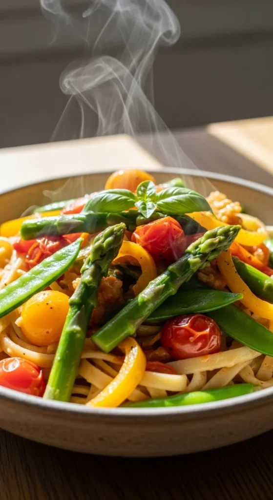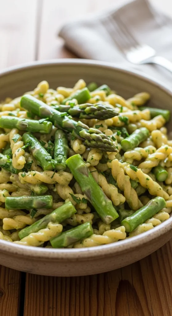 This pasta blends tender asparagus with a smooth cream sauce that feels fresh and seasonal. The green vegetables add a crisp texture that balances the creamy base beautifully.