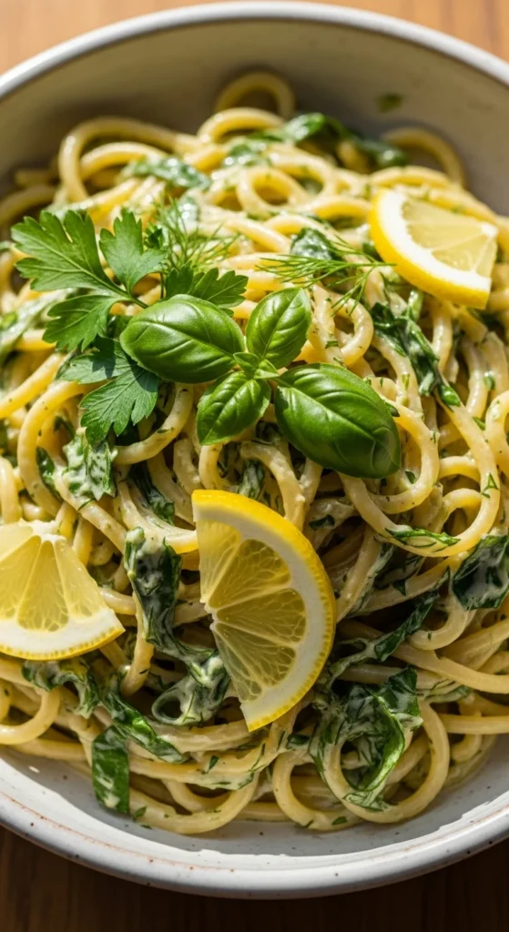 This pasta blends creamy sauce with herbs and lemon, creating a fresh spring flavor.