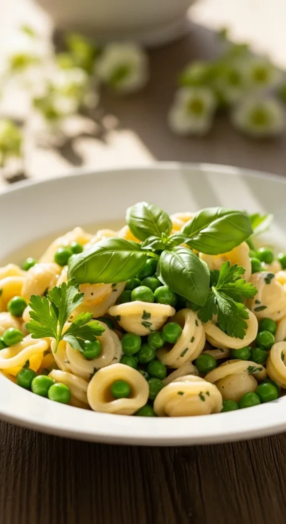 This pasta feels light with sweet peas and a soft creamy texture. The fresh green color makes it perfect for spring tables and family meals.