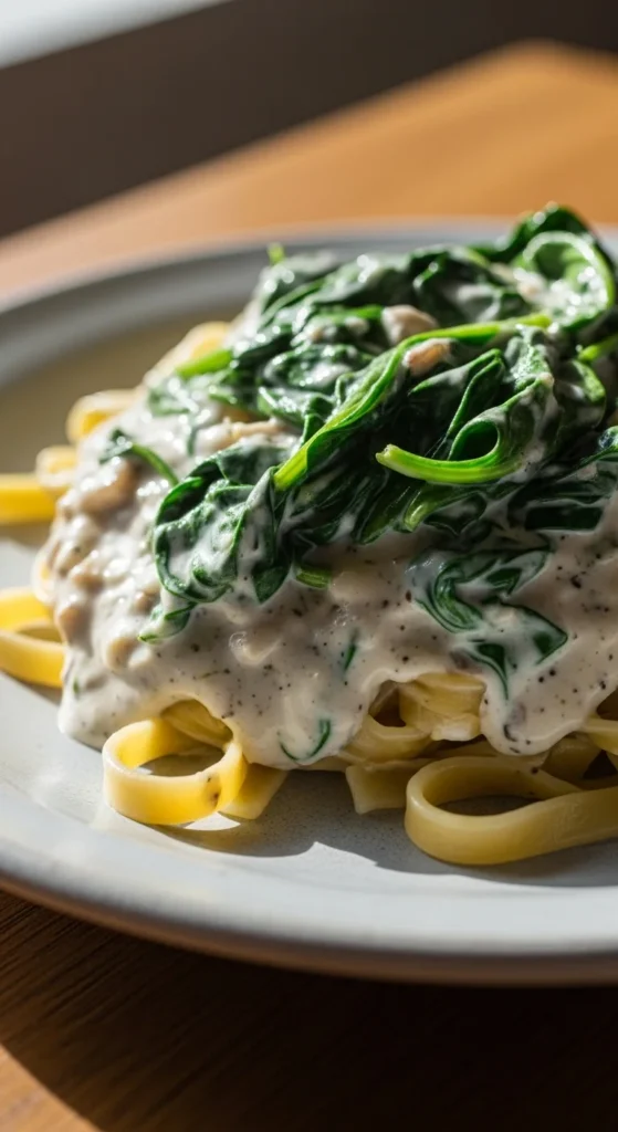 This pasta blends creamy sauce with fresh spinach, creating a smooth and balanced dish. It feels light yet satisfying.
