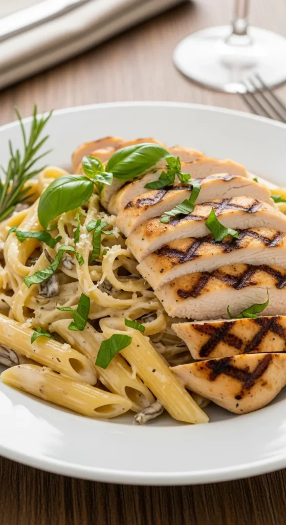 This pasta blends tender chicken with creamy sauce and herbs. It feels filling yet balanced.